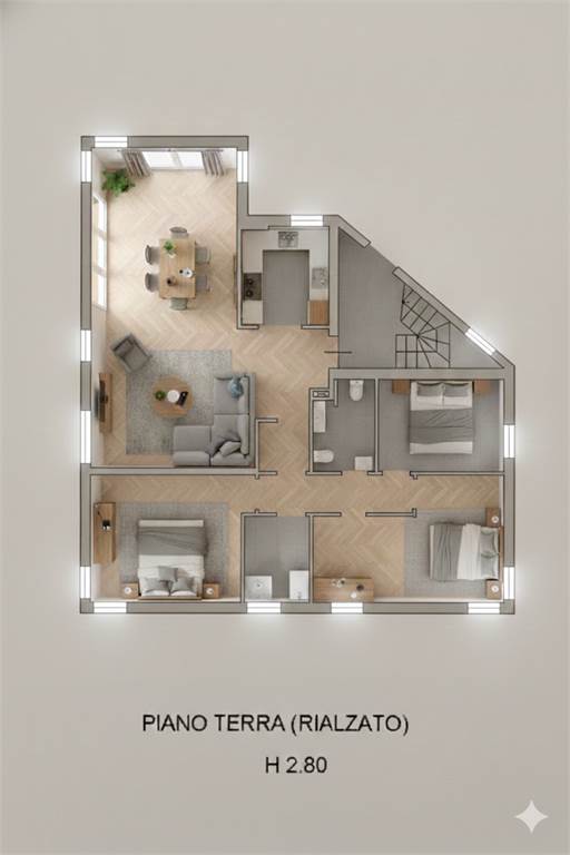 - Impianto di raffrescamento con 4 split (uno nel soggiorno e uno in ogni camera);